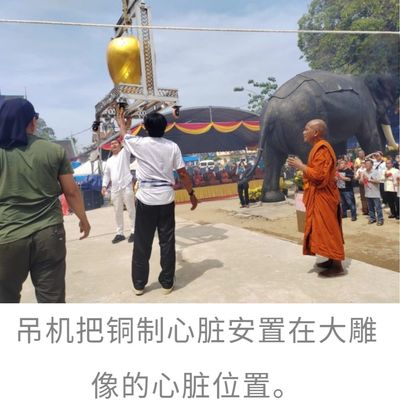最后再由重型吊机把铜质的“心脏”吊起来,安置在督拉惹(龙婆坤)大雕像里面。为期4天4夜的大型庆典,就在庄严的气氛下,圆满完成。